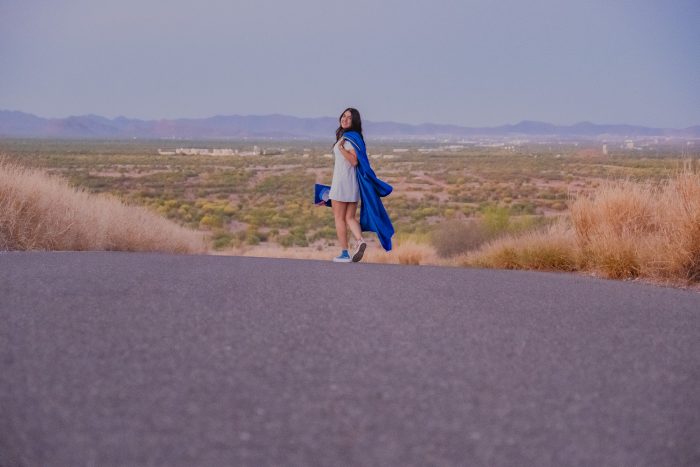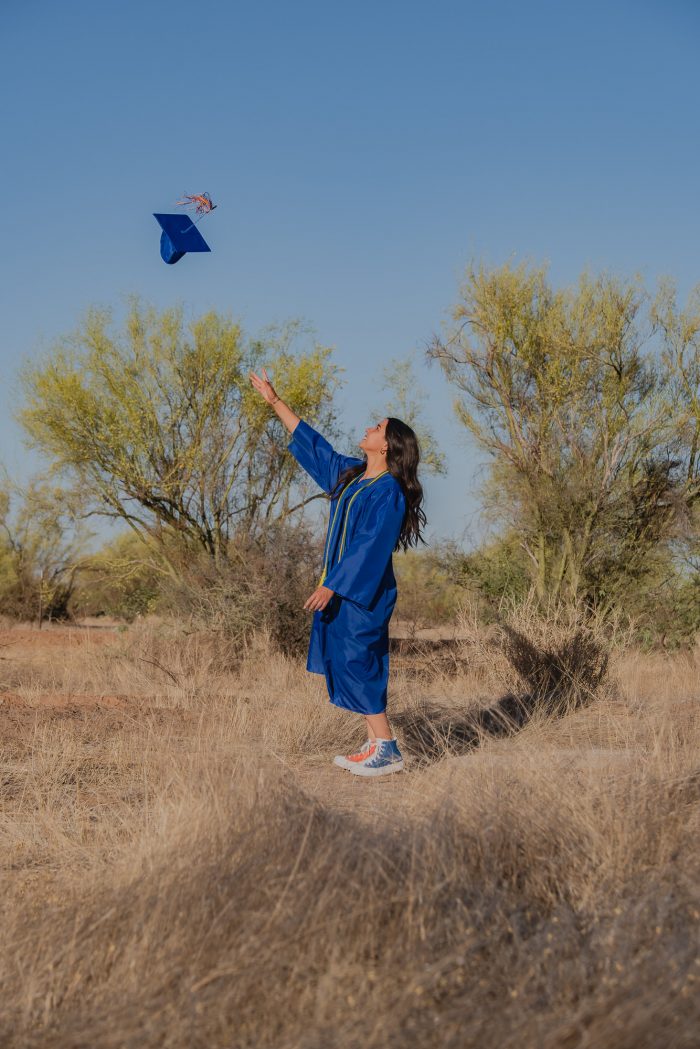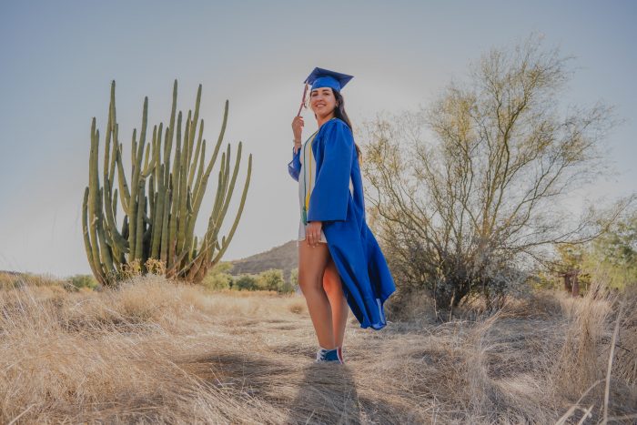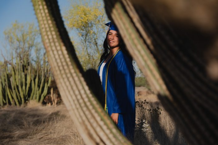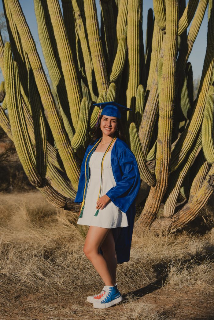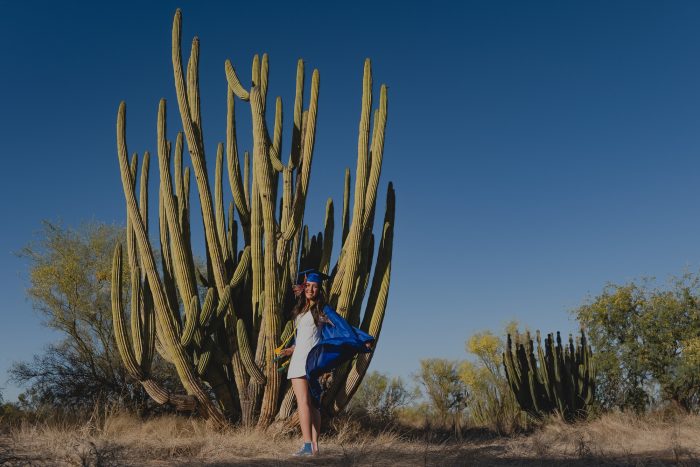 Me encantó que eligiera un escenario tan poco común para una sesión de graduación, los verdes de los cactus, el amarillo del pasto contrastan super bien con el azul de la toga y el birrete y hacen que destaque esta bellísima graduante.